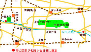 小金井桜は元文2年(1737)、武蔵野新田世話役であった川崎平右衛門 定孝が幕命によって植えたといわれる。 小金井橋を中心に玉川上水の両岸6`にわたって、山桜約2000本を植 えた。小金井橋のたもとにある海岸寺の碑文に「新田開発のため桜を植 えた」と記されている。 植樹の理由については「新田の賑わいのため」「桜の花びらは上水を浄 化すると信じられていた」「花見客に堤を踏み固めさせるため」 などの推 測がある。 その桜並木は江戸時代から関東随一の桜の名所として知られ、歌川広 重の錦絵などで紹介され、人気は高まった。 嘉永年間には田無村名主・下田半兵衛によって大規模な補植が行われ 明治16年(1883) には明治天皇が訪れ、その記念樹である 「行幸松」が 海岸寺の山門前、玉川上水北側遊歩道にある。 サクラ博士として知られる理学博士 ・三好学は36品種と亜種3品種によ る山桜大集植地としての沿革、樹形特性などを調査、「天然品種の植物 群落」と評価して、大正13年(1924)国の名勝に指定された。 山桜の寿命は50年から120年とされ、並木の欅で日当たりが悪化。五日 市街道の排ガスの影響もあって、多くの桜は枯死あるいは老木化、いま や桜の名所にかつての面影はない。 ・・・・・・・・・・・・・・・・・・・・・・・・・・・・・・・・・・・・・・・・・・・・・・ |
