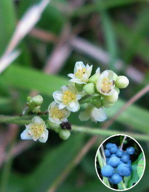 秋、落葉の時期が始まる項、ムラサキシキブやガマズミ等上水の種々な樹木が果実をつけて、美しく照り輝く。 そのような中で落葉性の蔓草であるアオツヅラフジの青黒く熟した直径1p程の液果も、一段と美しく目に付くようになる。 アオツヅラフジの蔓は丈夫で、ツヅラを編むツヅラフジの仲間であることからの名であると言う。 別名、力ミエビとも言われる。カミは神で、エビとは古語のブドウを指すのだと言う。食べられないから神のブドウと称するとも。 鋸歯のない卵型の葉は、蔓に似ず少し大型でよく茂り、葉の脇から長さ10p位の花茎を伸ばして多数の黄白色の小さな花を密集してつける。 直径5ミリにも満たない小さな花は、意識して見なければ見過ごしてしまう。毎年、旧商大橋のらんかんから、じっくり楽しませてくれていたアオツヅラフジの花と果実が、橋の大型化工事でいとも簡単に消え去ってしまったが、自生野草保護ゾーンで多少見られる。 |