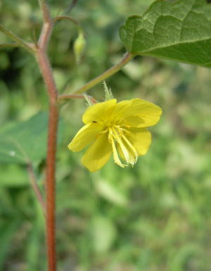 細く直立した80センチ前後の茎、そしていくつかのに分枝した枝茎の赤い色が緑濃い夏草の中で目にあざやかに写る。 茎の葉脈から出た花茎に1個ずつ、品のある5弁の黄色の花が下向きに咲き、茎の赤色と合せて味わいのある野草である。 花の時期は初秋で茎は木質でやや硬く、春の季節は薄茶の色にすぎないが、夏に向かうにつれ赤色を濃くしてくる。