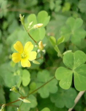 この『玉川上水草樹の花』シリーズの総目次を点検してカタバミが落ちこぼれているのに気がついた。 そこらじゅうにある雑草の代表的なカタバミだが、上水堤ではそれほど多くない。春から秋にかけてフェンス際で遠慮がちに生息しているように見える。 3枚のハートの尖った先が合わさった葉は、雨が降ったり夜になると閉じる。その閉じた葉が半分食べられてしまったように見えることから片喰と名づけられたという。葉が赤紫色の種はアカカタバミとのこと。 地面に這った細い茎先に直径1〜1.5センチぐらいの黄色の5弁花を次々に咲かせている。 葉や茎に蓚酸(しゅうさん)を含み酸味があることから、漢方では酢漿草(サクショウソウ)という生薬名で呼ばれ、その絞り汁は虫さされに効果があるそうだ。和名も酢漿草と書いてある図鑑も。 匍匐枝を出して周囲に伸びたり,根が鱗茎のようになっている上にロケット型の莢果がパッチンと弾けて、種子を飛ばすので、草引きをさぼると一面に繁殖してしまう。夏休みに炎天下でカタバミ退治に手を焼かせられたので夏の花の印象が強い。 |