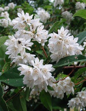 ♪卯の花の匂う垣根に♪…と唱歌(佐々木信綱:作詞)で歌われ、夏の訪れを告げるウツギのたわわな花房が5月下旬に上水堤で見られる。 ウツギの和名は空木と書いて、枝茎の中心部が空洞なことから、うつろな木を意味している。 新田開発時代には畑の反ごとにウツギを植えて、境界の目印にしたと言われ、その名残りで上水堤にもウツギが多いのではないだろうか。 5月下旬に咲く花は多数に枝分かれした側枝の先端部に、円錐花序を多くつける。純白のモスリンのような花冠は径1センチぐらい、黄色の花芯を覗かせ密をふんだんに出しているので、蜂や小さな昆虫が群がって生物の営みを観察できる。 土地の人の話しでは堤にはマルバウツギやコゴメウツギもあるとのこと。 |